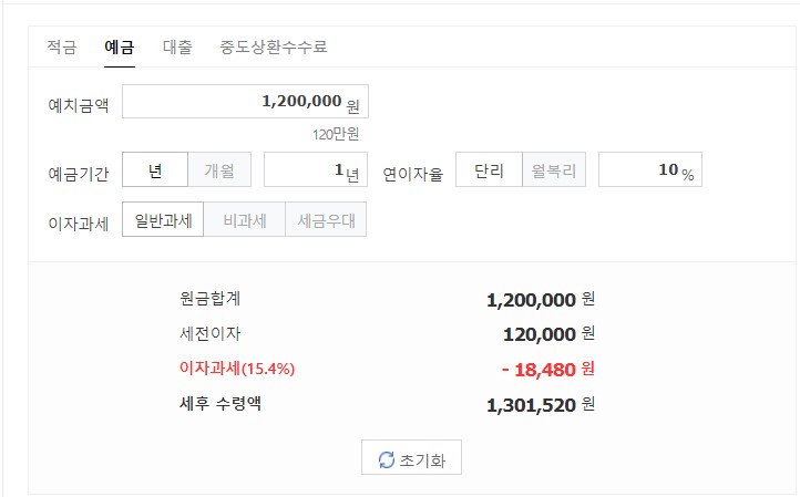예치할 금액, 예금기간, 연이자율, 이자과세를 입력하면 계산이 된다.