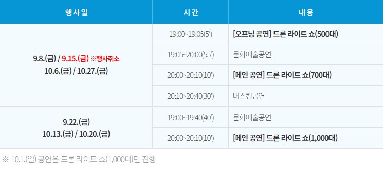배터리의 한계로 10여 분의 짧은 드론라이트 쇼 공연을 제공할 수밖에 없는 아쉬움을 해소하고자, 저녁 7시부터 약 한 시간 동안 사전 문화예술공연이 더해집니다. 다만, 10월 1일에는 사전 문화예술공연 없이 본 공연인 드론 라이트 쇼만 진행될 예정입니다.